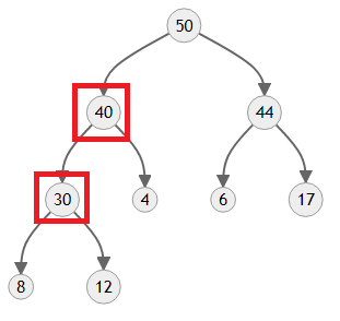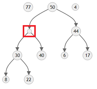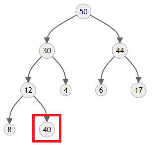 마찬가지로 30과 40 중 더 큰 자식인 40에게 자리를 양보합니다. 이러면 4에게는 더 이상 자식이 없고, 힙도 정상적인 모양으로 돌아오게 됩니다.