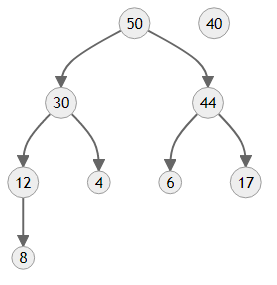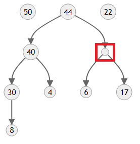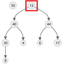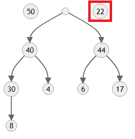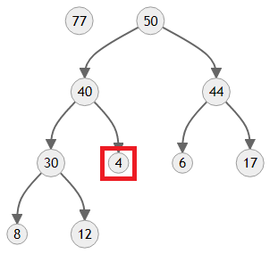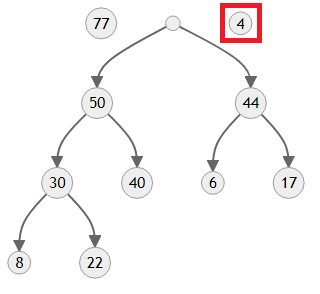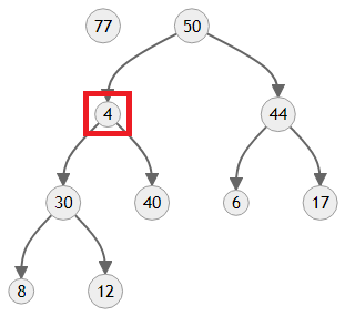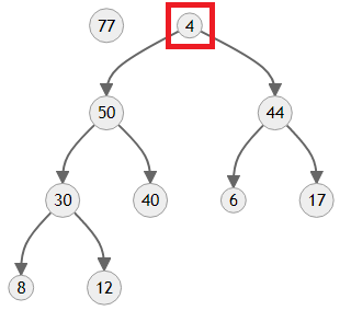 만들어진 트리의 모양을 보면 4보다 우선순위가 한참 높은 50과 44가 자식에 있기 때문에 올바른 힙이 아니에요. 이제 4를 제자리로 보내야 합니다.