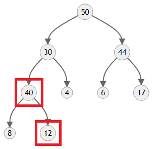 근데 이러면 문제가 있어요. 노드의 자식들은 본인보다 우선순위가 높아서는 안 되는데, 12의 자식인 40이 훨씬 우선순위가 높습니다. 이러면 자연계의 대법칙인 약육강식의 논리를 사용해서 12를 끌어내리면 됩니다.